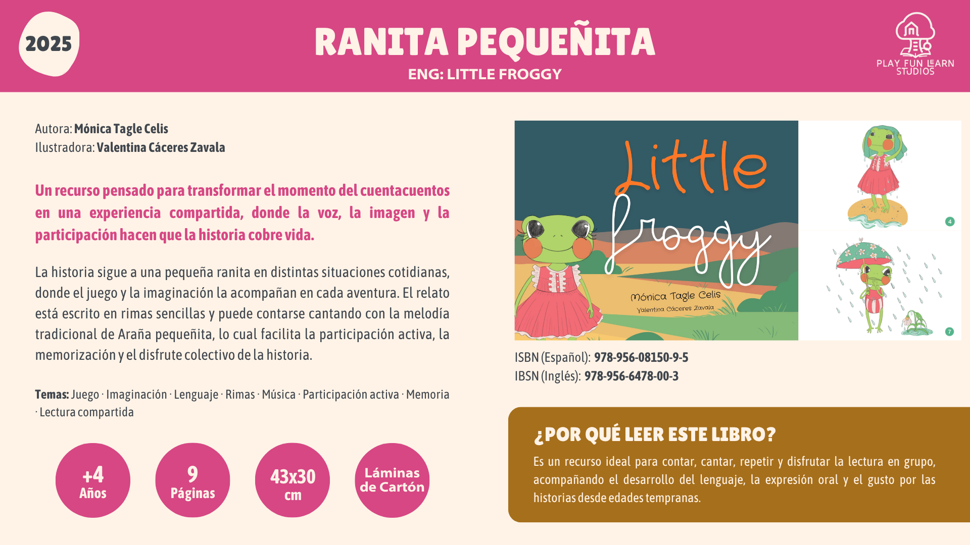 Ranita Pequeñita es un recurso ideal para contar, cantar, repetir y disfrutar la lectura en grupo, acompañando el desarrollo del lenguaje, la expresión oral y el gusto por las historias desde edades tempranas.